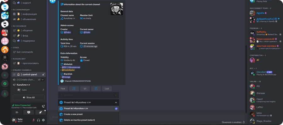 Пресет (предустановка) - набор настроек канала, которые пользователь создает во время пользования каналом. Каждый пользователь имеет возможность создать до 6 таких пресетов. Каждый пресет - это отдельный набор настроек канала: название, вместимость, белый и черный списки, видимость, доступность и не только.