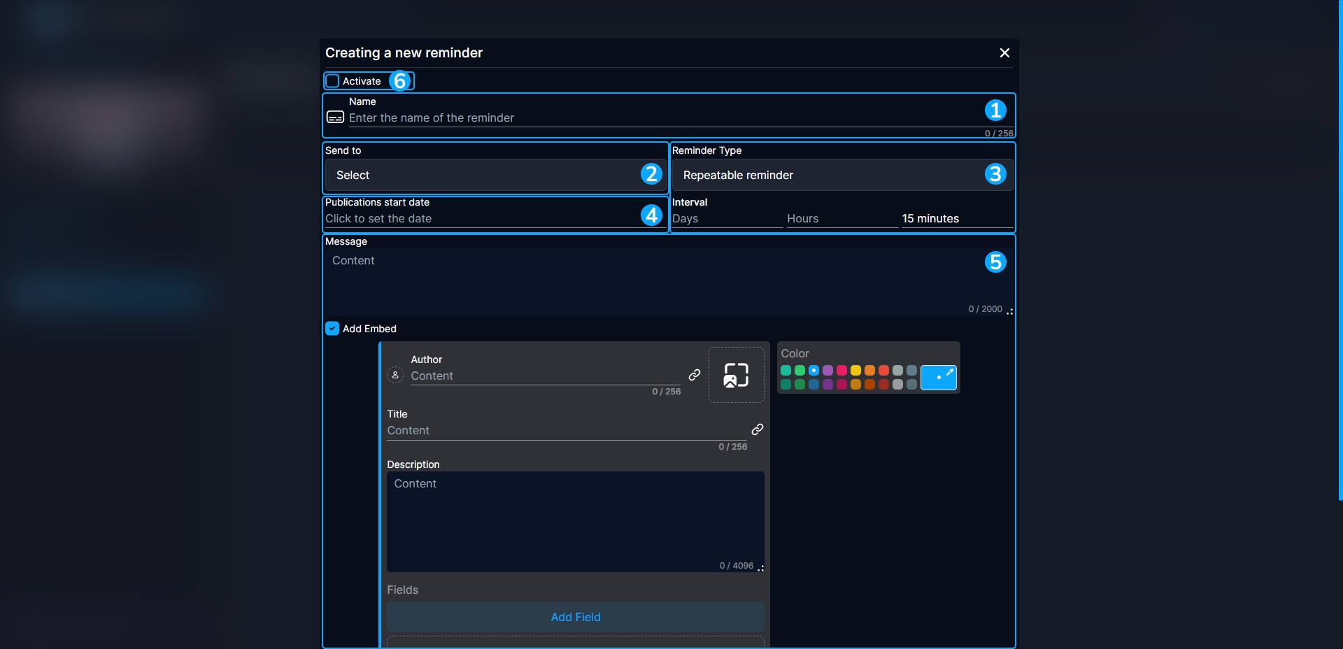 Выберите тип напоминания: Однократное напоминание или повторяемое. Повторяемое напоминание будет отправляться в целевой канал раз в выбранный промежуток времени, а однократное напоминание отправит сообщение лишь единожды;